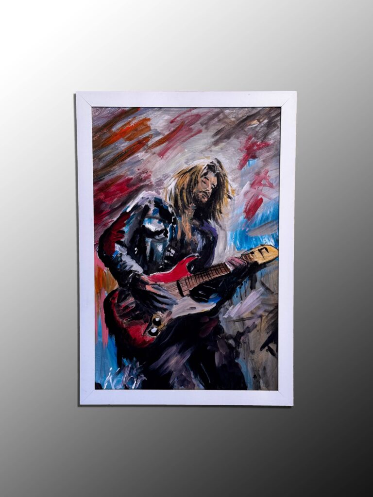 Ez a festmény, amely egy gitárost ábrázol, amint szenvedélyesen játszik hangszerén, az energia, a zene és az alkotás erejének lenyűgöző szimbóluma. Az élénk színek, a vastag ecsetvonások és a dinamikus kompozíció mind együttesen teremtenek egy olyan atmoszférát, amely a zene lüktetését és a művész belső világát tárja fel. A gitáros alakja, hosszú hajával és elmerült tekintetével, mély érzelmeket ébreszt, mintha a dallamok a lelkéből fakadnának.