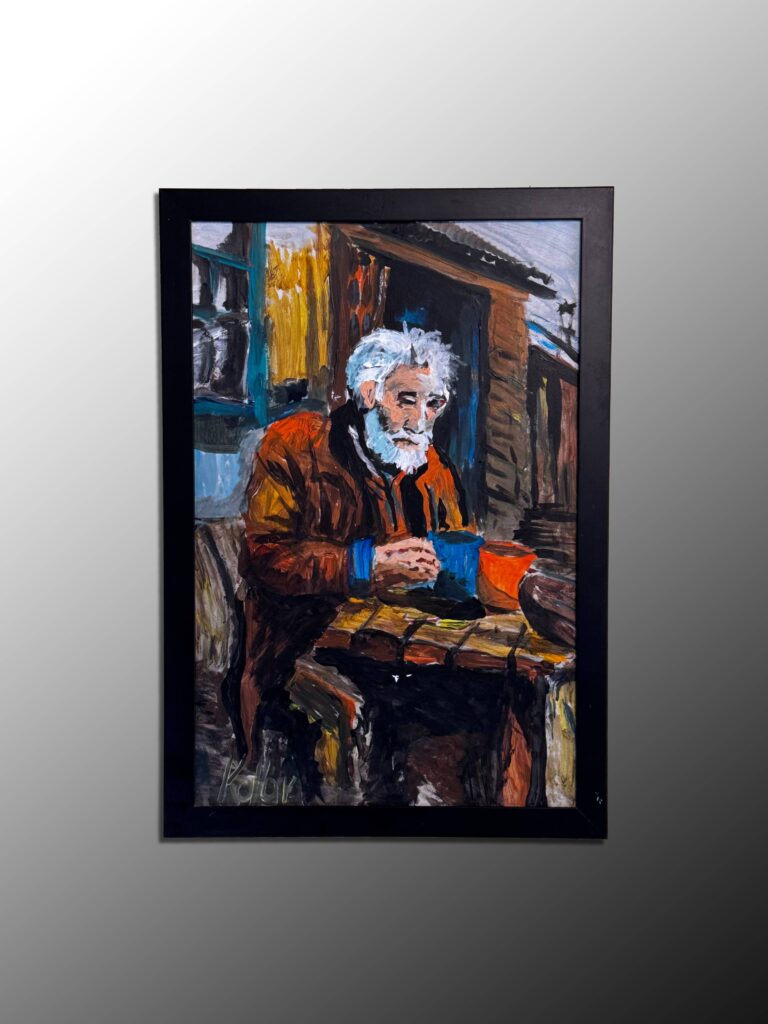 Ez a festmény egy férfit ábrázol egy széken ülve, absztrakt, szürke és sárga háttér előtt. A férfi alakja sötét tónusokkal van megfestve, ami kiemeli a magányt és a befelé fordulást. A lendületes ecsetvonások és a kontrasztos színek dinamikus hatást keltenek, mintha a férfi gondolatait és érzéseit tükröznék. A sárga szín foltja a háttérben reményt vagy belső fényt sugározhat, ellensúlyozva a sötétebb árnyalatokat.