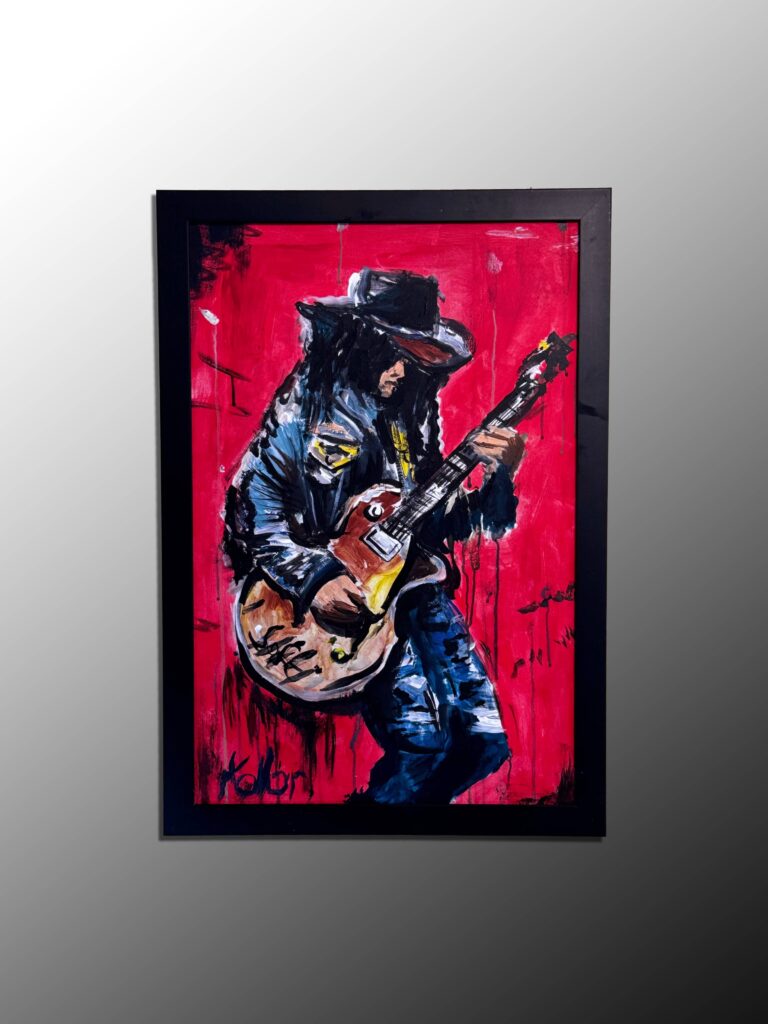 Ez a festmény, amely egy gitárost ábrázol, amint szenvedélyesen játszik hangszerén, az energia, a rock ‘n’ roll és a zene erejének lenyűgöző szimbóluma. Az élénk vörös háttér, a sötét ruházat és a gitár meleg tónusai drámai kontrasztot teremtenek, és élettel töltik meg a képet. Az ecsetvonások lendületesek és kifejezőek, szinte hallani véljük a gitár riffjeit és a zene lüktetését. A gitáros alakja, kalapjával és elmerült tekintetével, mély érzelmeket ébreszt, mintha a dallamok a lelkéből fakadnának.