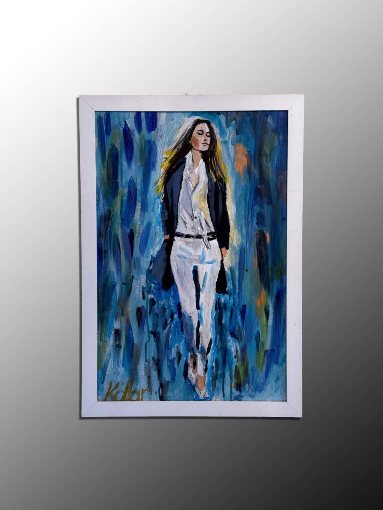 Ez a festmény, amely egy modern nőt ábrázol, amint magabiztosan lép előre egy absztrakt, kék árnyalatú háttér előtt, az erő, a függetlenség és a stílus lenyűgöző szimbóluma. A nő alakja eleganciát és magabiztosságot sugároz, miközben a háttérben lévő kék és narancssárga ecsetvonások dinamikus kontrasztot teremtenek, és élettel töltik meg a képet. A fény és árnyék játéka kiemeli az arcvonásokat és a ruha redőit, mélységet és dimenziót adva az alkotásnak.