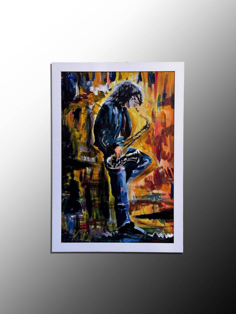 Ez a festmény egy szenvedélyesen zenélő szaxofonost ábrázol, aki beleolvad a hangulatokkal teli, élénk háttérbe. A dinamikus ecsetkezelés és az erőteljes, meleg színek szinte hallhatóvá teszik a jazzt – mintha a festményből áradna a dallam. A kép hangulata egyszerre melankolikus és élettel teli: a muzsikus magába mélyedve, mégis teljes átéléssel játszik, mintha minden hang egy érzést mesélne el. A 60×40 cm-es akril festmény keretezve, gondosan csomagolva várja új otthonát – ahol remélhetőleg nemcsak a falat, hanem a szíveket is megtölti majd zenével.