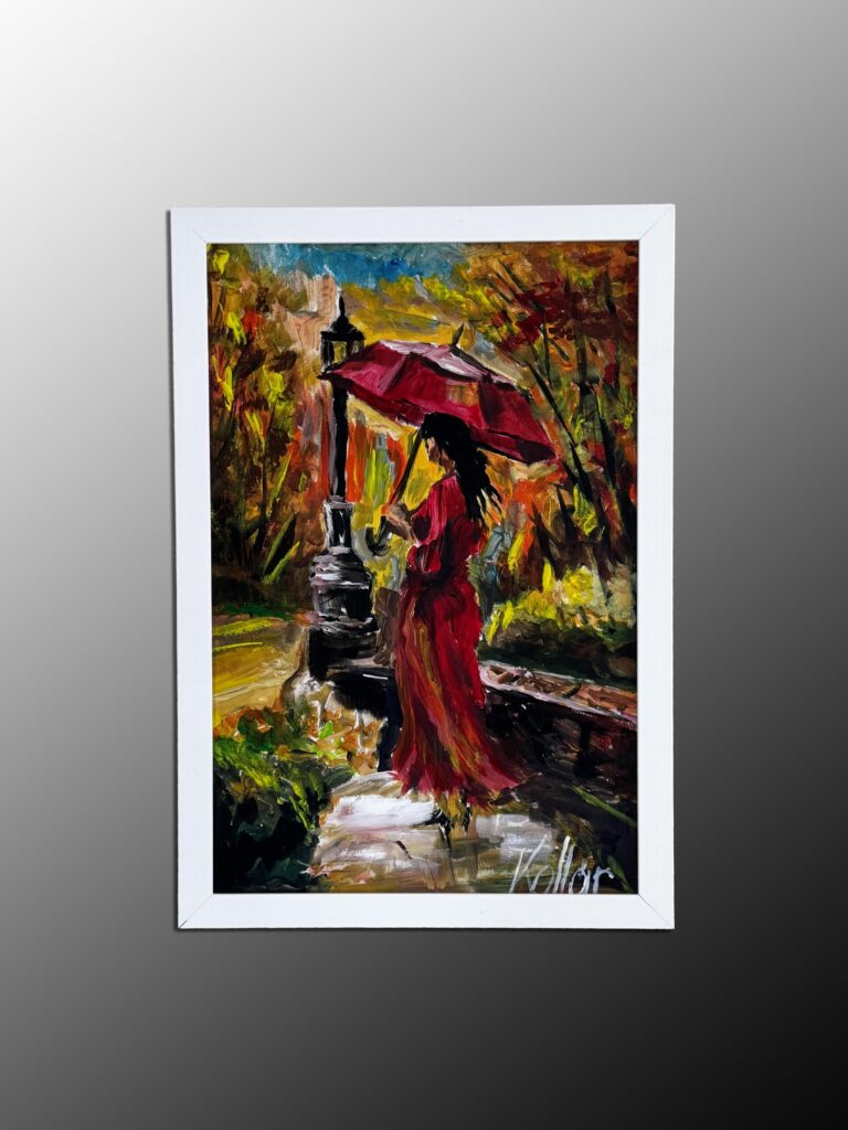 Ez az akrilfestmény egy hangulatos, atmoszférikus jelenetet ábrázol, amelyben a színek és a textúrák mesélnek. A kép középpontjában egy karcsú, vörös ruhás nő áll, kezében egy élénkpiros esernyővel, mely szinte izzik a sötétebb tónusú háttér előtt. Alakja elegáns és titokzatos, a ruhája és esernyője színe gyönyörűen harmonizál és emeli ki őt a kompozícióból.