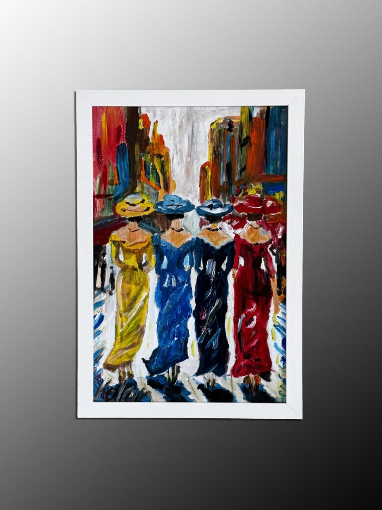 Ez az akril festmény egy dinamikus és stilizált csoportképet ábrázol, amely négy elegánsan öltözött női alakot mutat, amint kalapban és hosszú ruhában sétálnak egy absztrakt, városi környezetben. A kép színes és kifejező, tele energiával és egyedi hangulattal.