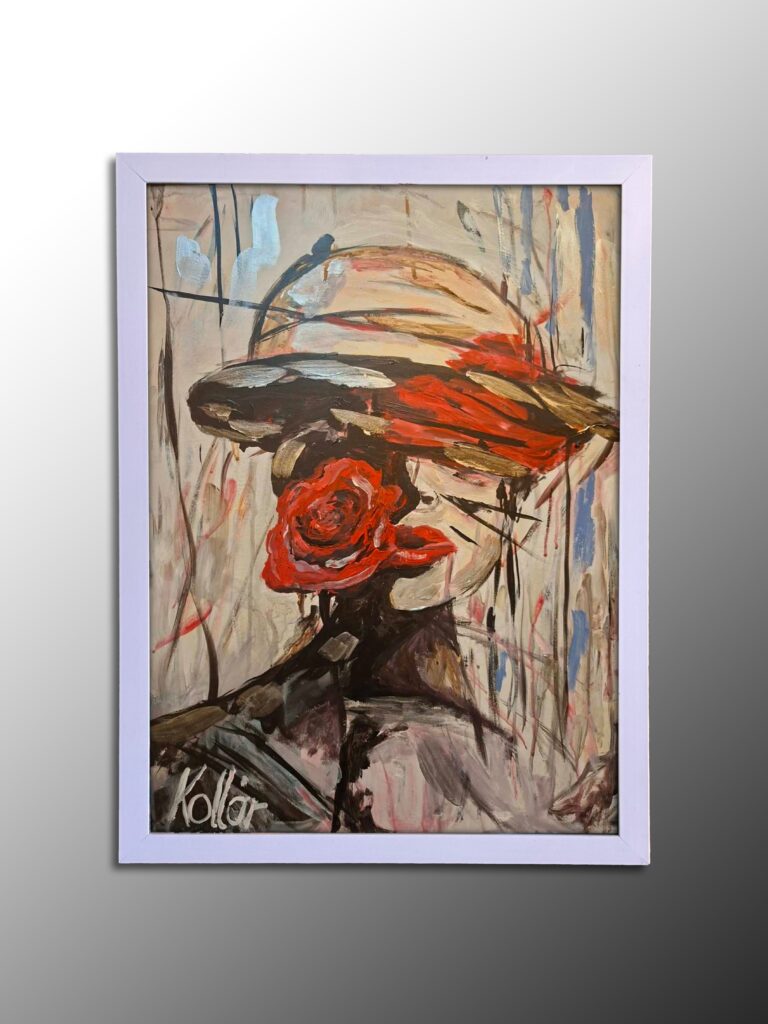 Ez a festmény a női rejtélyt és a klasszikus romantika erejét sűríti magába, ahol egy kalapos hölgy arcát a vörös rózsa és a szemet takaró sáv teszi titokzatossá. A műalkotás az anonimitást, a kifinomultságot és az el nem mondott szavakszépségét ünnepli, a merész ecsetvonásokkal és a földszínek, valamint a vibráló vörös kontrasztjával kiemelve a kompozíció drámaiságát. A rózsa központi elhelyezkedése és a hölgy tartása egy mesélő, érzelmileg telített jelenetetteremt, amely azonnal elindítja a néző képzeletét.