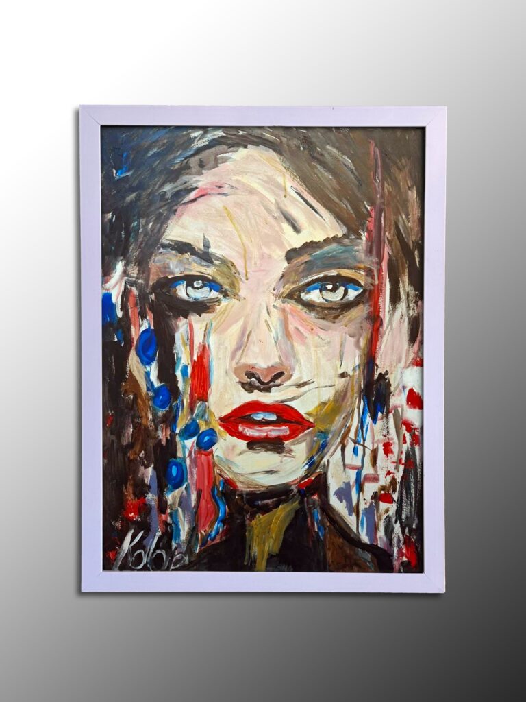 Ez a festmény az emberi lélek mélységét és a pillanatnyi megállás erejét sűríti magába, ahol a nagyméretű, igéző szemek, mint az érzelmek kapui, fogva tartják a nézőt. A műalkotás az őszinteséget, a sebezhetőséget és a belső szépségetünnepli, a gazdag textúrákkal és a bátor színhasználattal (tüzes vörös ajkak, mélybarna tónusok és élénk kék részletek) kiemelve az arc karakteres vonásait. A festék rétegződése és a nyers, expresszív vonalvezetés egy mesélő, vibráló jelenetet teremt, amely képes betölteni a teret.