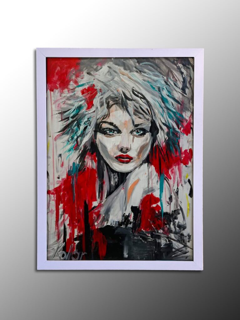 Ez a festmény a modern női karakter és a belső erő vibráló energiáját sűríti magába, ahol az expresszív vonalak és a kontrasztos színek egy átható személyiséget keltenek életre. A műalkotás az önbizalmat, a függetlenséget és a kortárs elegancia vadságát ünnepli, a merész, szinte nyers ecsetvonásokkal, valamint a drámai színpalettával (mélyvörös, éjfekete és tiszta fehér) kiemelve a kompozíció feszültségét. A modell igéző, türkizkék pillantása egy titokzatos, dinamikus jelenetet teremt, amely azonnal párbeszédbe elegyedik a szemlélővel.