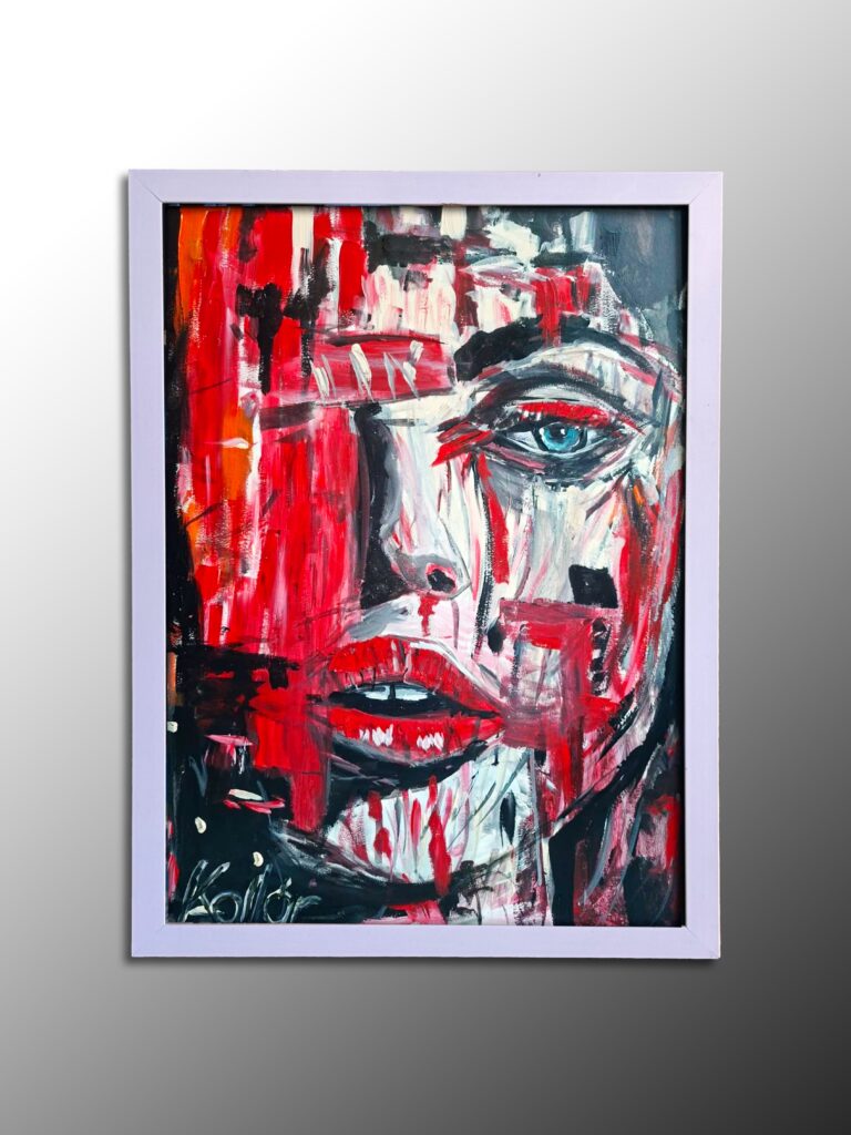 Ez a festmény az érzelmek elemi erejét és a belső lüktetést sűríti magába, ahol az arc vonásai szinte eggyé válnak a dinamikus ecsetvonásokkal. A műalkotás a szenvedélyt, a kitartást és a megalkuvást nem ismerő energiát ünnepli, a radikális vörös tónusok, a mélyfeketék és a tiszta fehér kontrasztjával kiemelve a kompozíció szuggesztív erejét. Az arc egyik oldalát uraló függőleges sávok és a megmaradó, éber tekintet egy mesélő, feszültséggel teli jelenetet teremt, amely nem hagyja nyugodni a szemet.