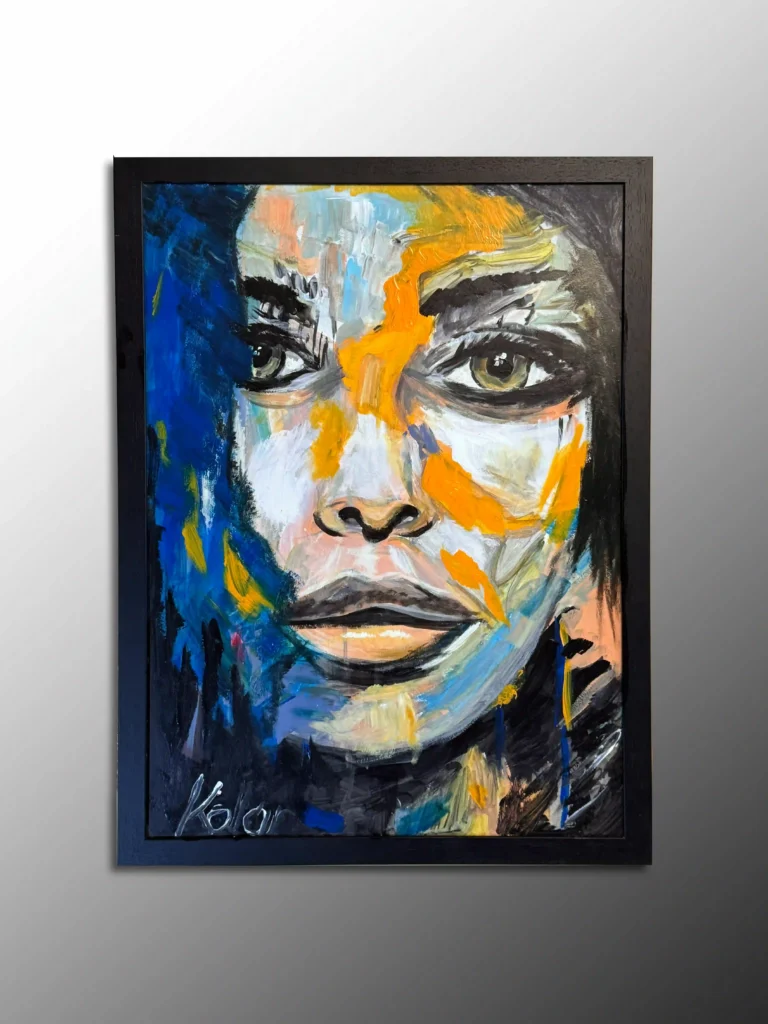 Ez a festmény a belső erő és a rejtett érzelmek vibráló energiáját sűríti magába, ahol az átható tekintet és az absztrakt színfoltok egy mély és misztikus személyiséget keltenek életre. A műalkotás az önismeretet, a kitartást és a kortárs elegancia drámaiságát ünnepli, a merész ecsetvonásokkal és a kontrasztos színpalettával (mélykék, tüzes narancs, tiszta fehér és fekete) kiemelve a kompozíció feszültségét. Az arc egyik oldalát uraló sötét árnyék és a megmaradó, éber tekintet egy mesélő, szuggesztív jelenetet teremt, amely nem hagyja nyugodni a szemet.