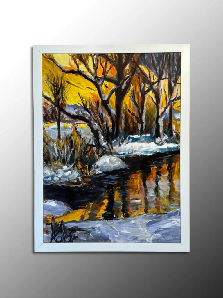 Ez a festmény a természet megnyugtató erejét és az alkonyat utolsó, lángoló fényeit sűríti magába, ahol az aranyló égbolt visszatükröződik a csendes folyó felszínén. A műalkotás az időtlenséget, a békét és a természet örök körforgásátünnepli, a merész ecsetvonásokkal és a gazdag színpalettával (ragyogó okkersárga, mélybarnák és hűvös kékek) kiemelve a táj drámai szépségét. A kopár fák sziluettje és a hófoltokkal tarkított partmenti jelenet egy mesélő, meditatív hangulatot teremt, amely azonnal nyugalmat áraszt a környezetében.