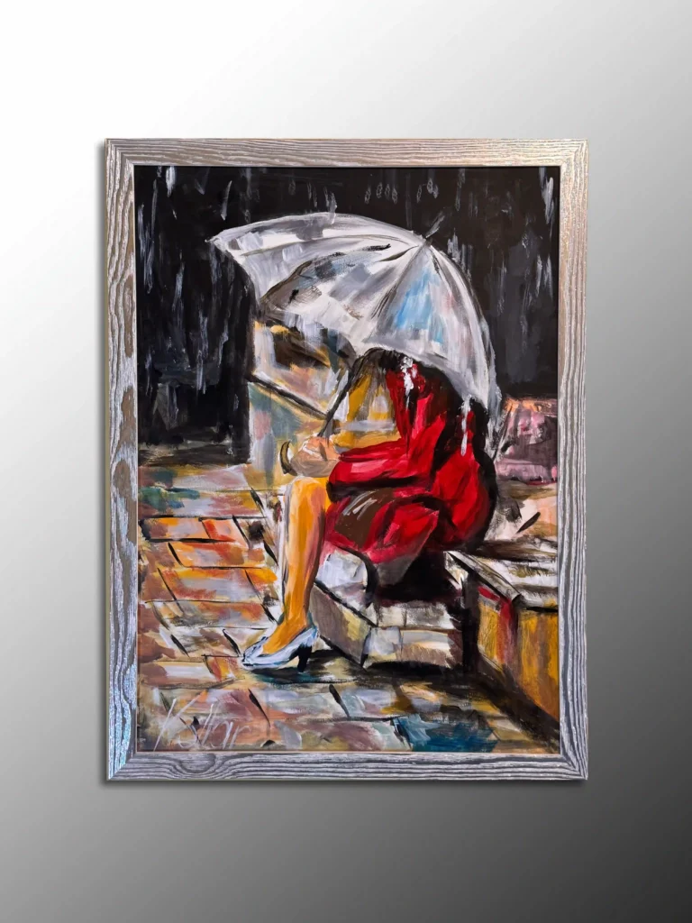 Ez a festmény a városi magány és a várakozás romantikus pillanatát sűríti magába, ahol az esernyő alatt meghúzódó, vörös kabátos nő alakja fénylő pontként ragyog fel a sötét háttér előtt. A műalkotás a türelmet, a titokzatosságot és a nagyvárosi melankóliát ünnepli, a merész és lendületes ecsetvonásokkal, valamint a drámai kontrasztokkal (tüzes vörös, tiszta fehér és mélyszürke) kiemelve az utcakövek csillogását. A kompozíció intimitása és az esernyő védelmező íve egy mesélő, érzelmileg telített jelenetet teremt, amely azonnal beindítja a néző képzeletét.